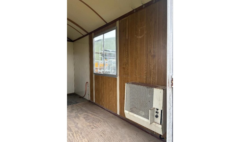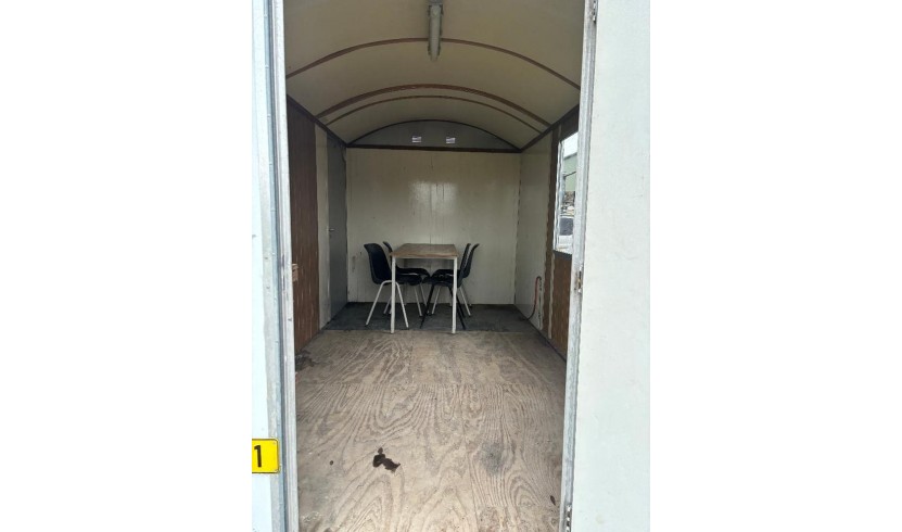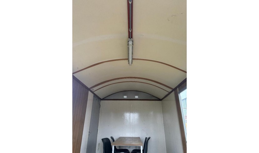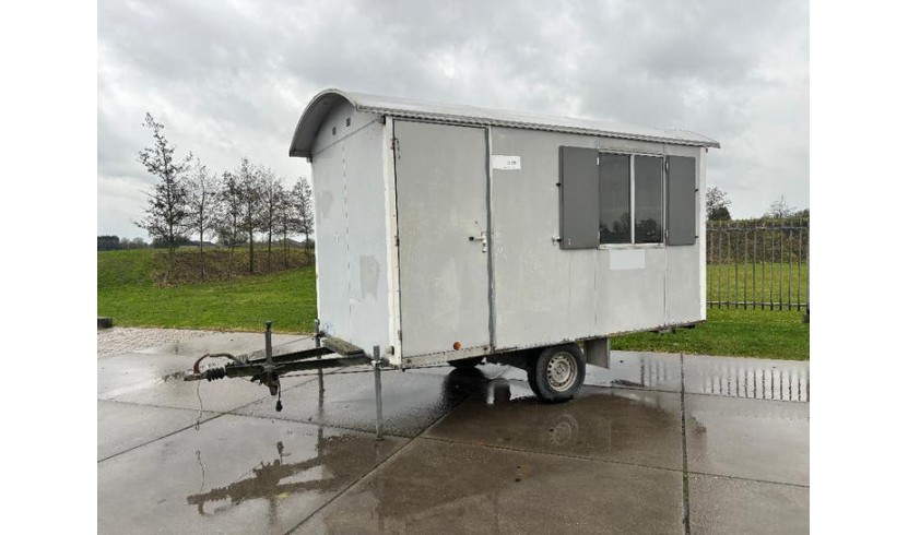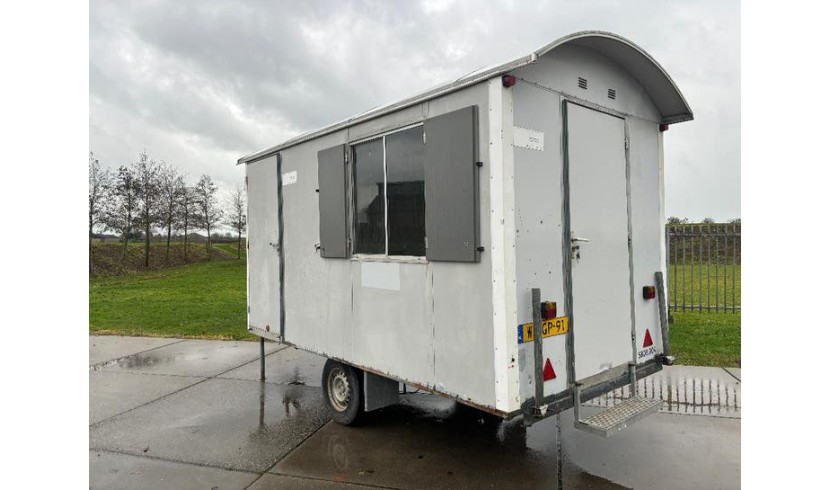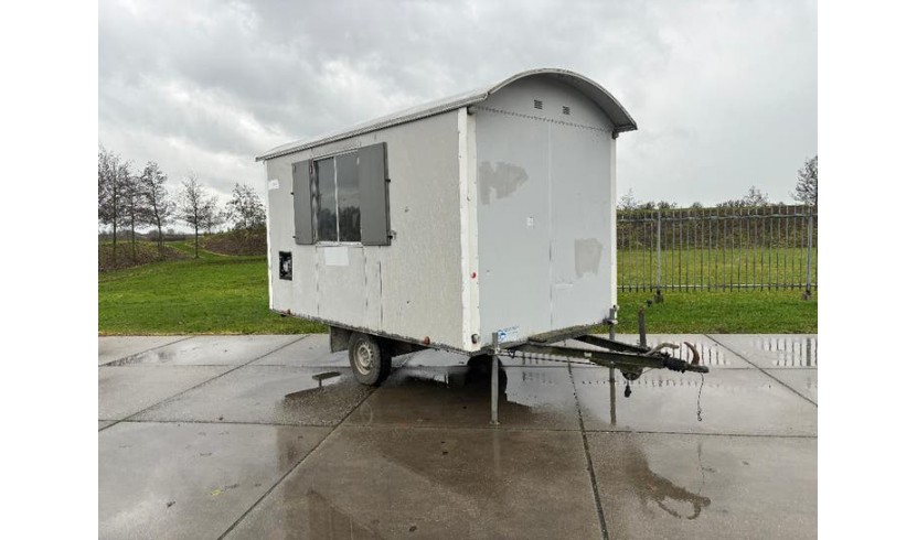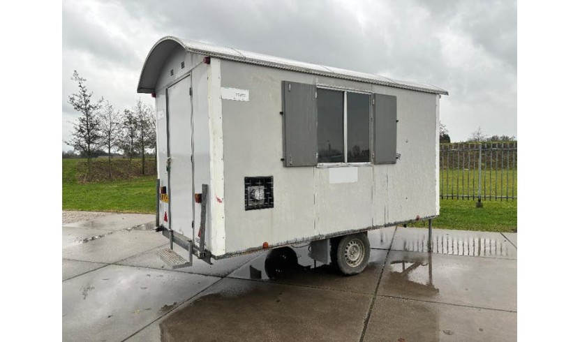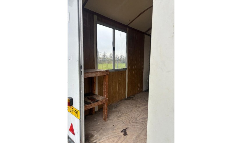 Voorzien van tafel en stoelen, gaskachel, tl-verlichting, 2 ramen met luiken, opstaptrede