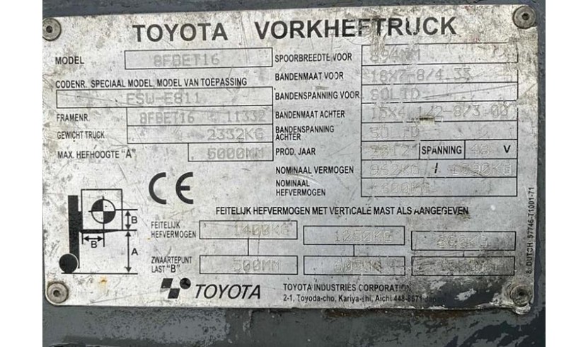 2012 Toyota 8FBET16 elektrische heftruck met 4901uur