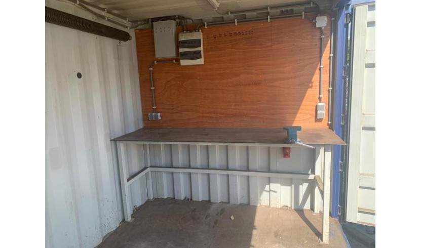 Voorzien van: elektrische verwarming, werkbank met stalen werkblad, bankschroef, groepen kast, 4x wcd 230V, 2x wcd 32A, ledverlichting